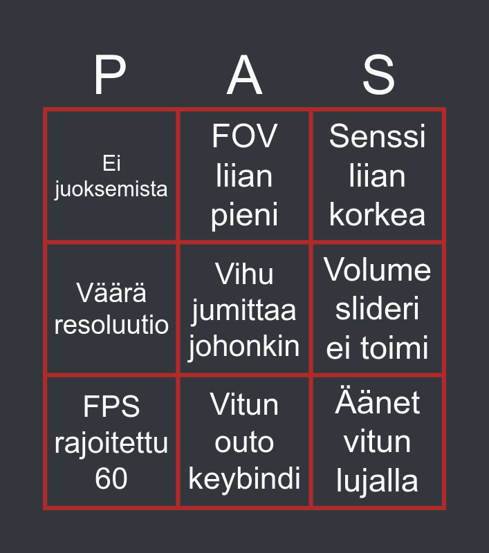 This bingo card has 50 words: Äänet vitun lujalla, Kova käynnistysääni, Lobby ei toimi, Steam invite ei toimi, Motion blur päällä, Senssi liian korkea, FOV liian pieni, Ei pysty reconnectaa, Volume slideri ei toimi, Absurdi volume slideri, FPS rajoitettu 60, Väärä resoluutio, Asetukset resettaa, Peli kaatuu, Joku disconnectaa, Sekava cutscene, Vitun outo keybindi, Käynnistyy windowedissa, Voice chat ei toimi jollakin, Vihu jumittaa johonkin, Hiton vähän staminaa, Pelihahmo huohottaa jatkuvasti, Ei juoksemista, Äänet vitun lujalla, Kova käynnistysääni, Lobby ei toimi, Steam invite ei toimi, Motion blur päällä, Senssi liian korkea, FOV liian pieni, Ei pysty reconnectaa, Volume slideri ei toimi, Absurdi volume slideri, FPS rajoitettu 60, Väärä resoluutio, Asetukset resettaa, Peli kaatuu, Joku disconnectaa, Sekava cutscene, Vitun outo keybindi, Käynnistyy windowedissa, Voice chat ei toimi jollakin, Vihu jumittaa johonkin, Hiton vähän staminaa, Pelihahmo huohottaa jatkuvasti, Ei juoksemista, Edistyminen ei tallennu, Esine bugittaa maahan, Pelaaja jumittuu johonkin and Vihollinen tappaa seinän läpi.