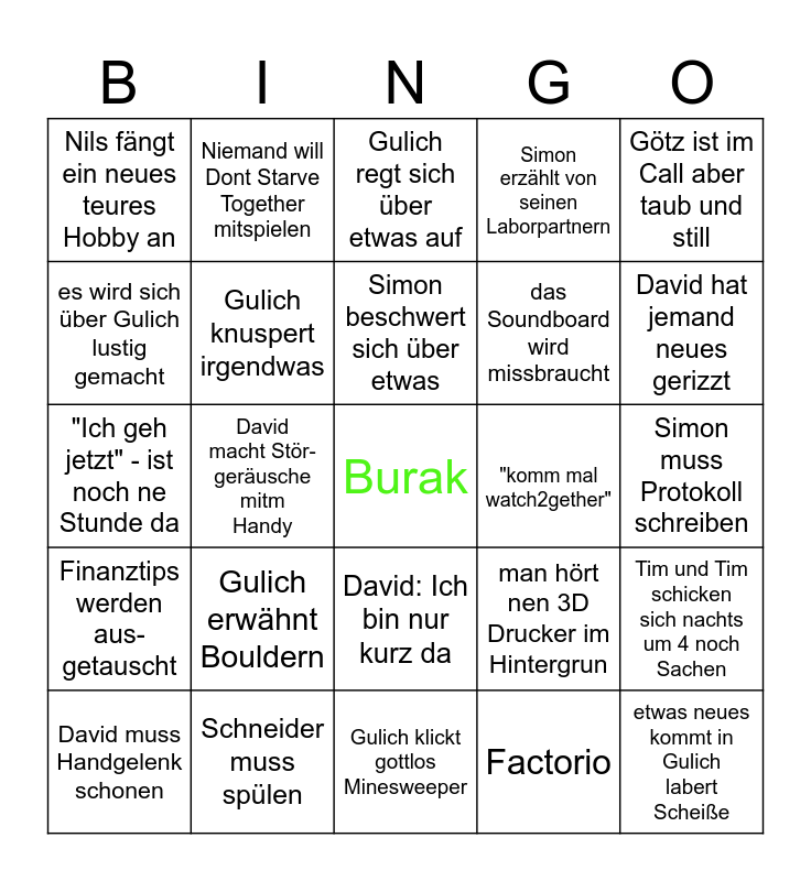This bingo card has a free space and 24 words: Gulich erwähnt Bouldern, Schneider muss spülen, Simon beschwert sich über etwas, David muss Handgelenk schonen, Götz ist im Call aber taub und still, Nils fängt ein neues teures Hobby an, es wird sich über Gulich lustig gemacht, Niemand will Dont Starve Together mitspielen, "komm mal watch2gether", David: Ich bin nur kurz da, das Soundboard wird missbraucht, "Ich geh jetzt" - ist noch ne Stunde da, man hört nen 3D Drucker im Hintergrun, Tim und Tim schicken sich nachts um 4 noch Sachen, Gulich knuspert irgendwas, Factorio, Simon muss Protokoll schreiben, Gulich regt sich über etwas auf, David hat jemand neues gerizzt, David macht Stör-geräusche mitm Handy, etwas neues kommt in Gulich labert Scheiße, Finanztips werden aus-getauscht, Simon erzählt von seinen Laborpartnern and Gulich klickt gottlos Minesweeper.