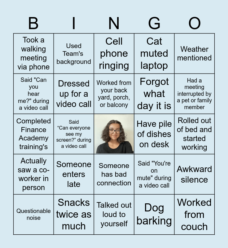 This bingo card has a free space and 24 words: Someone enters late, Snacks twice as much, Worked from your back yard, porch, or balcony, Questionable noise, Weather mentioned, Took a walking meeting via phone, Said "Can you hear me?" during a video call, Used Team's background, Have pile of dishes on desk, Someone has bad connection, Forgot what day it is, Completed Finance Academy training's, Said "You're on mute" during a video call, Awkward silence, Dressed up for a video call, Dog barking, Rolled out of bed and started working, Cell phone ringing, Had a meeting interrupted by a pet or family member, Said “Can everyone see my screen?” during a video call, Worked from couch, Actually saw a co-worker in person, Cat muted laptop and Talked out loud to yourself.