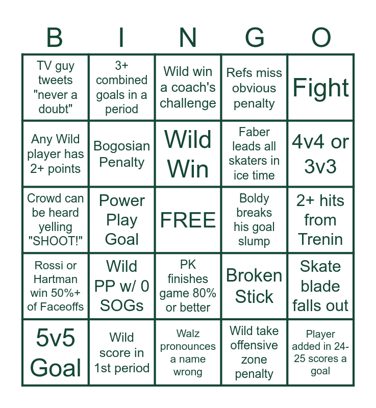 This bingo card has a free space and 29 words: 5v5 Goal, PK gives up goal within 20 seconds of PP starting, Power Play Goal, Wild hit the Post, TV guy tweets "never a doubt", Wild win a coach's challenge, Bogosian Penalty, Wild PP w/ 0 SOGs, Boldy breaks his goal slump, Wild score in 1st period, 2+ hits from Trenin, Player added in 24-25 scores a goal, Walz pronounces a name wrong, Wild take offensive zone penalty, 4v4 or 3v3, 10+ save period from Gus, PK finishes game 80% or better, Rossi or Hartman win 50%+ of Faceoffs, Fight, Crowd can be heard yelling "SHOOT!", Broken Stick, Tarps off interview, Faber leads all skaters in ice time, Any Wild player has 2+ points, Refs miss obvious penalty, 3+ combined goals in a period, Skate blade falls out, Wild Win and Wild have 30+ SOGs.