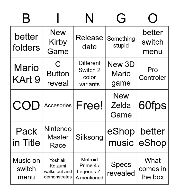 This bingo card has a free space and 24 words: Nintendo Master Race, Yoshiaki Koizumi walks out and demonstrates, Different Switch 2 color variants, Music on switch menu, better switch menu, better folders, Mario KArt 9, New Kirby Game, New Zelda Game, Silksong, New 3D Mario game, COD, eShop music, better eShop, C Button reveal, Specs revealed, 60fps, Release date, Pro Controler, Accesories, What comes in the box, Pack in Title, Something stupid and Metroid Prime 4 / Legends Z-A mentioned.