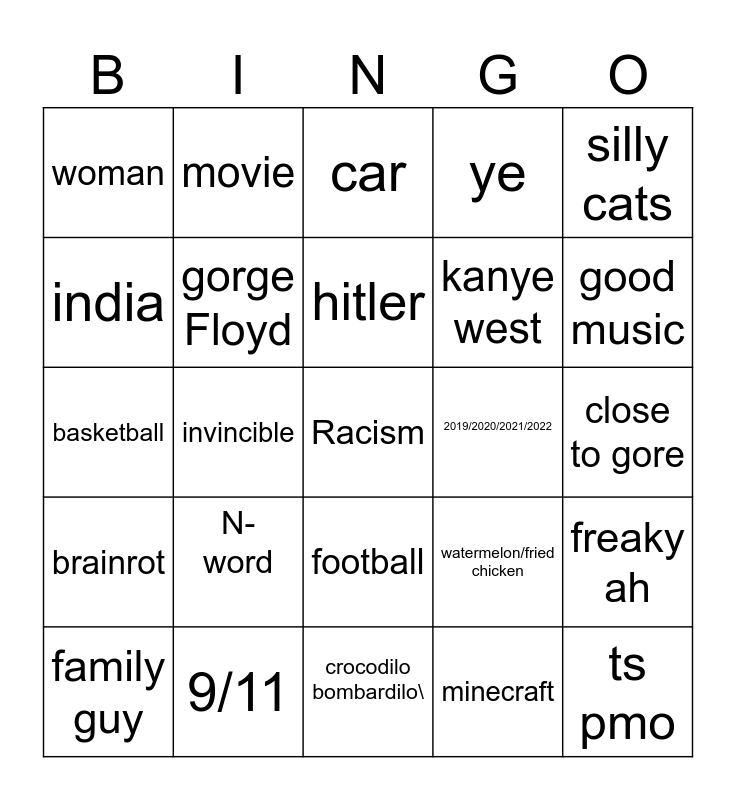 This bingo card has a free space and 24 words: N-word, 9/11, hitler, family guy, silly cats, woman, india, movie, 2019/2020/2021/2022, football, kanye west, basketball, watermelon/fried chicken, freaky ah, gorge Floyd, minecraft, close to gore, car, good music, invincible, ts pmo, brainrot, ye and crocodilo bombardilo\.