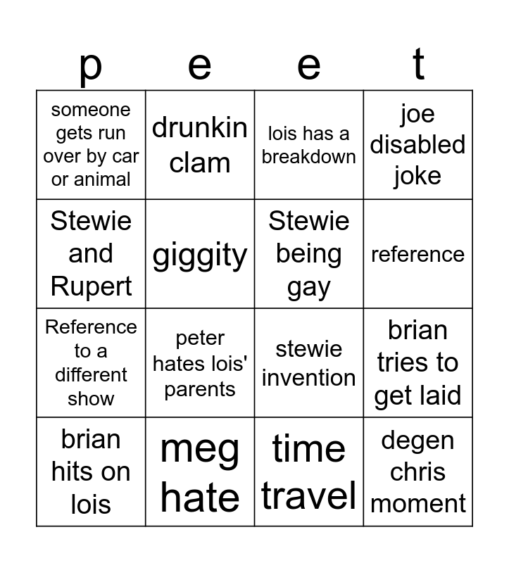 This bingo card has 25 words: death pose, laugh at a joke, reference, cut away, Stewie and Rupert, someone gets run over by car or animal, giggity, drunkin clam, meg hate, chris being stupid, Reference to a different show, stewie invention, joe joke on being disabled, Lois tells peter not to do something, Stewie being gay, peter laugh, time travel, lois has a breakdown, peter hates lois' parents, brian tries to get laid, brian hits on lois, wholesome chris moment, degen chris moment, joe disabled joke and family guy death pose.