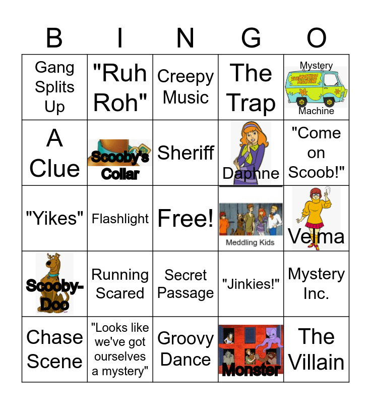 This bingo card has 17 images, a free space and 53 words: Scooby Snack, Scooby-Doo, Shaggy, The Fortune Teller, Secret Passage, Scooby-Doo "Gulps", The Trap, "Scooby-Doo, where are you?", A Clue, "Zoinks!", Gang Splits Up, Fred, "Looks like we've got ourselves a mystery", Chase Scene, Unmasking the Villain, Groovy Dance, The Villain, Daphne, Shaggy and Scooby are the Bait, Velma, "Jinkies!", Trap Door, Mystery Machine, Velma's Glasses, "Ruh Roh", Scrappy-Doo, Fred's Ascot, Sandwich, Monster, Celebrity Guest, "Jeepers", "Do we have to?", Shaggy Holding Scooby, Creepy Music, Disguise, "Yikes", Mystery Inc., Shaggy's Brown Pants, Scooby's Collar, Daphne's Purple Dress, "The gang's all here", Haunted Mansion, "G-G-G-Ghost", Running Scared, Friends, Bats, Fog, Sheriff, Flashlight, "Come on Scoob!", Evil Laugh, Cemetery and Scooby Movies.