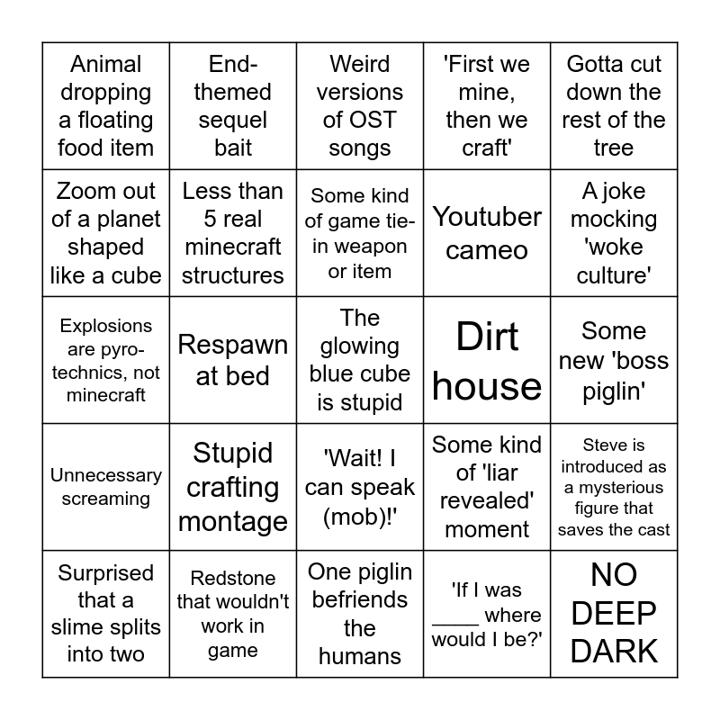 This bingo card has a free space and 24 words: Stupid crafting montage, Redstone that wouldn't work in game, Some kind of game tie-in weapon or item, Surprised that a slime splits into two, Gotta cut down the rest of the tree, Animal dropping a floating food item, Zoom out of a planet shaped like a cube, End-themed sequel bait, Dirt house, 'Wait! I can speak (mob)!', Youtuber cameo, Explosions are pyro-technics, not minecraft, Some kind of 'liar revealed' moment, Steve is introduced as a mysterious figure that saves the cast, Less than 5 real minecraft structures, 'If I was ____ where would I be?', Some new 'boss piglin', Weird versions of OST songs, A joke mocking 'woke culture', Respawn at bed, NO DEEP DARK, Unnecessary screaming, 'First we mine, then we craft' and One piglin befriends the humans.