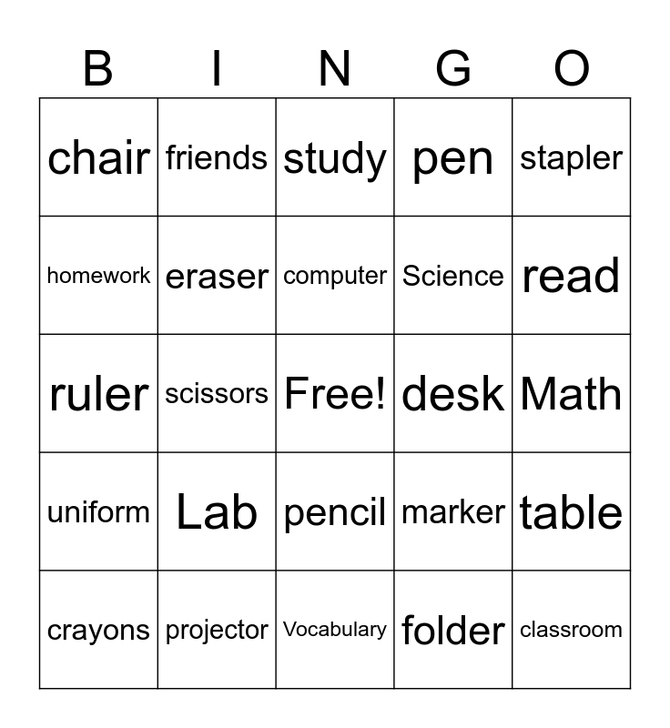 This bingo card has a free space and 35 words: teacher, student, major, eraser, pencil, pen, homework, pencil case, computer, bag, ruler, stapler, printer, notebook, chair, desk, folder, scissors, uniform, classroom, marker, crayons, table, projector, study, read, English, Korean, Science, Math, History, Vocabulary, Lab, friends and cafeteria.