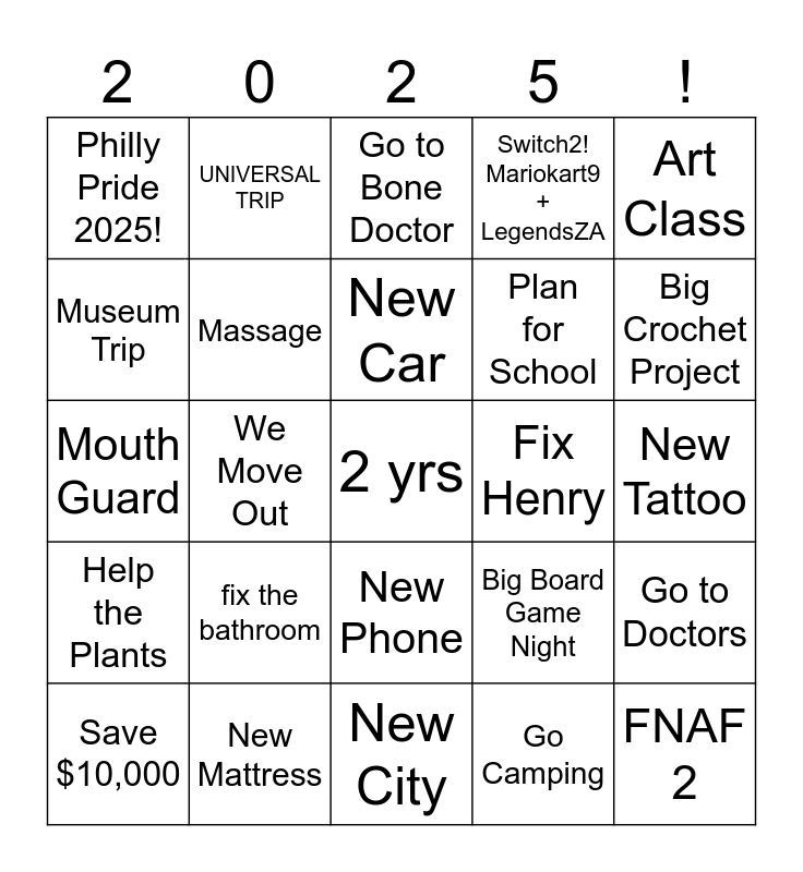 This bingo card has a free space and 24 words: fix the bathroom, New Mattress, New Car, Save $10,000, Art Class, Philly Pride 2025!, Museum Trip, UNIVERSAL TRIP, Fix Henry, New Phone, Plan for School, Mouth Guard, Big Board Game Night, Go to Doctors, Massage, Go Camping, New Tattoo, Go to Bone Doctor, Big Crochet Project, We Move Out, FNAF 2, Help the Plants, Switch2! Mariokart9 + LegendsZA and New City.