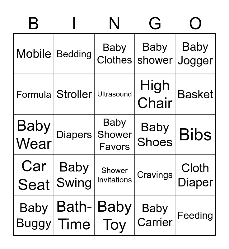 This bingo card has 44 words: Bottle, Baby Shower Favors, Baby Food, Baby Buggy, Baby Bottle, Baby Carrier, Baby Clothes, Baby Bath, Baby Jogger, Bath-Time, Baby shower, Baby Shoes, Shower Invitations, Baby Swing, Baby Sitter, Baby Toy, Baby Walker, Baby Wear, Baby's Name, Basket, Bedding, Bassinet, Registry, Mobile, Lullaby, Bibs, Booties, Bouncer Seat, Cravings, Car Seat, Changing Table, Cloth Diaper, Cradle, Crib, Diapers, Diaper Bag, Blanket, Feeding, Ultrasound, Formula, High Chair, Infant Carrier, Stroller and Baby Shower Gifts.