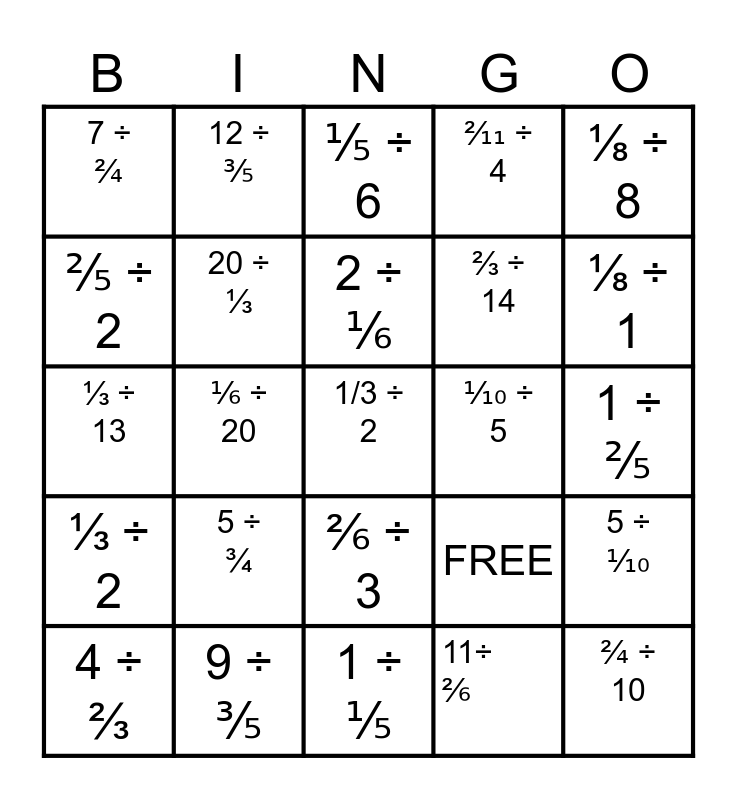This bingo card has a free space and 25 words: 5 ÷ ¾, 1 ÷ ⅕, 2 ÷ ⅙, 4 ÷ ⅔, ⅛ ÷ 8, 7 ÷ ²⁄₄, ⅖ ÷ 2, 12 ÷ ⅗, ⅒ ÷ 5, ²⁄₆ ÷ 3, ⅔ ÷ 14, ⅓ ÷ 13, FREE, 5 ÷ ⅒, 20 ÷ ⅓, ²⁄₁₁ ÷ 12, 1 ÷ ⅖, ⅕ ÷ 6, ⅛ ÷ 1, ⅙ ÷ 20, ²⁄₄ ÷ 10, 9 ÷ ⅗, ⅓ ÷ 2, ²⁄₁₁ ÷ 4 and 11÷ ²⁄₆.