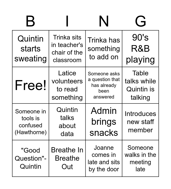 This bingo card has 16 words: Breathe In Breathe Out, Introduces new staff member, Trinka has something to add on, Quintin starts sweating, Someone in tools is confused (Hawthorne), Trinka sits in teacher's chair of the classroom, Admin brings snacks, Joanne comes in late and sits by the door, Free!, Latice volunteers to read something, "Good Question"-Quintin, 90's R&B playing, Quintin talks about data, Table talks while Quintin is talking, Someone asks a question that has already been answered and Someone walks in the meeting late.
