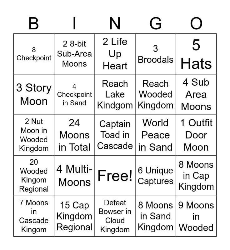This bingo card has 26 words: Free!, 8 Moons in Sand Kingdom, Reach Lake Kindgom, 15 Cap Kingdom Regional, 5 Hats, 8 Checkpoint, 3 Story Moon, 2 8-bit Sub-Area Moons, 1 Outfit Door Moon, 6 Unique Captures, Reach Wooded Kingdom, 2 Nut Moon in Wooded Kingdom, 8 Moons in Cap Kingdom, 7 Moons in Cascade Kingom, 24 Moons in Total, 500 Coins on Screen, 3 Broodals, 20 Wooded Kingom Regional, 2 Life Up Heart, Captain Toad in Cascade, 4 Sub Area Moons, Defeat Bowser in Cloud Kingdom, World Peace in Sand, 4 Multi-Moons, 4 Checkpoint in Sand and 9 Moons in Wooded.