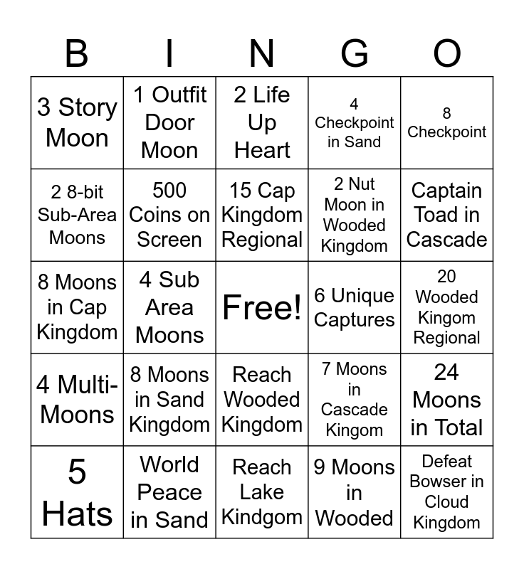 This bingo card has a free space and 25 words: 8 Moons in Sand Kingdom, Reach Lake Kindgom, 15 Cap Kingdom Regional, 5 Hats, 8 Checkpoint, 3 Story Moon, 2 8-bit Sub-Area Moons, 1 Outfit Door Moon, 6 Unique Captures, Reach Wooded Kingdom, 2 Nut Moon in Wooded Kingdom, 8 Moons in Cap Kingdom, 7 Moons in Cascade Kingom, 24 Moons in Total, 500 Coins on Screen, 3 Broodals, 20 Wooded Kingom Regional, 2 Life Up Heart, Captain Toad in Cascade, 4 Sub Area Moons, Defeat Bowser in Cloud Kingdom, World Peace in Sand, 4 Multi-Moons, 4 Checkpoint in Sand and 9 Moons in Wooded.