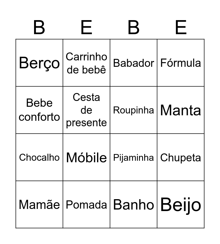 This bingo card has 30 words: Mamadeira, Fralda, Chupeta, Carrinho, Berço, Babador, Roupinha, Bicho-preguiça, Pomada, Lencinho umedecido, Banho, Mamãe, Papai, Canguru, Móbile, Coeiro, Caderneta, Beijo, Choro, Bebe conforto, Pijaminha, Meia, Carrinho de bebê, Chocalho, Cesta de presente, Fórmula, Berçário, Colinho, Manta and Cocheira.