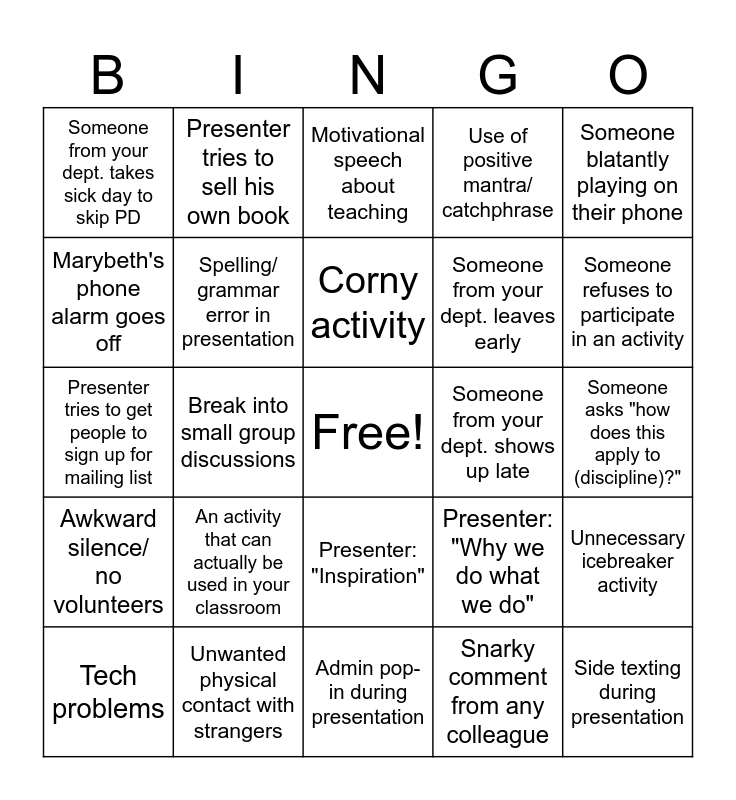 This bingo card has a free space and 24 words: An activity that can actually be used in your classroom, Unwanted physical contact with strangers, Corny activity, Tech problems, Someone blatantly playing on their phone, Someone from your dept. takes sick day to skip PD, Marybeth's phone alarm goes off, Presenter tries to sell his own book, Someone from your dept. shows up late, Presenter: "Inspiration", Someone from your dept. leaves early, Presenter tries to get people to sign up for mailing list, Presenter: "Why we do what we do", Unnecessary icebreaker activity, Spelling/ grammar error in presentation, Snarky comment from any colleague, Someone asks "how does this apply to (discipline)?", Motivational speech about teaching, Someone refuses to participate in an activity, Break into small group discussions, Side texting during presentation, Awkward silence/ no volunteers, Use of positive mantra/ catchphrase and Admin pop-in during presentation.
