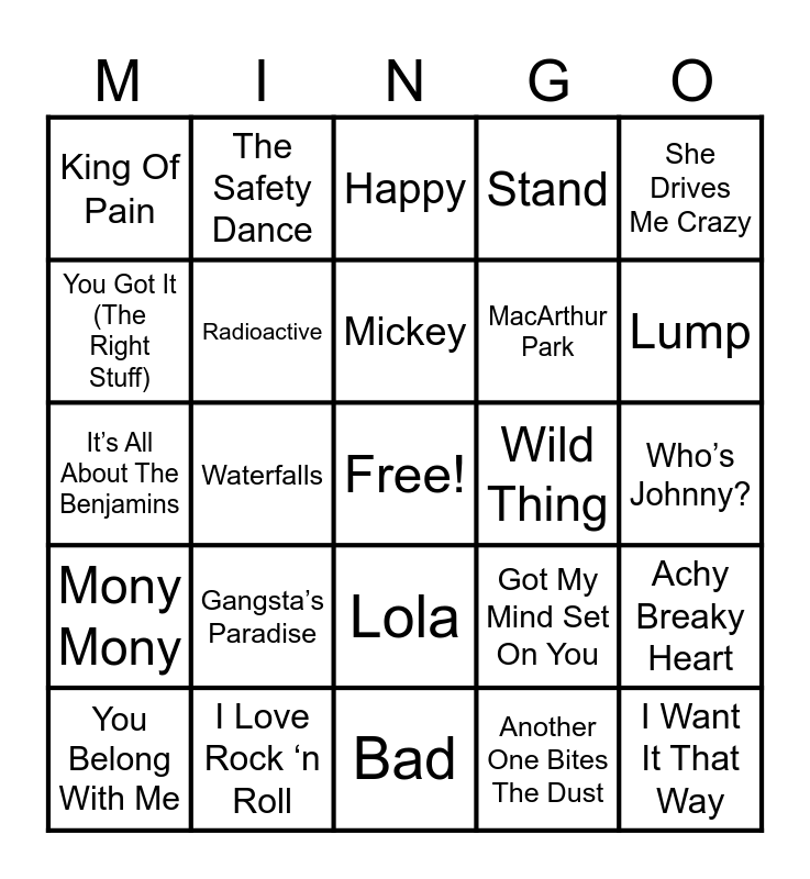 This bingo card has a free space and 30 words: I Love Rock ‘n Roll, Eye Of The Tiger, Waterfalls, Beat It, King Of Pain, Happy, Radioactive, Lola, Wild Thing, Bad, Who’s Johnny?, I Want It That Way, Another One Bites The Dust, Hot in Herre, Lump, Zoot Suit Riot, Got My Mind Set On You, Mony Mony, Gangsta’s Paradise, She Drives Me Crazy, It’s All About The Benjamins, Complicated, The Safety Dance, MacArthur Park, You Got It (The Right Stuff), Stand, Achy Breaky Heart, You Belong With Me, Mickey and Livin’ On The Edge.