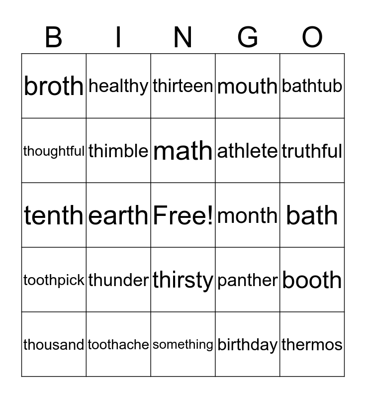 This bingo card has a free space and 24 words: thunder, toothache, math, thousand, bathtub, broth, thoughtful, healthy, month, thirsty, athlete, tenth, panther, booth, thimble, birthday, bath, thirteen, truthful, earth, thermos, toothpick, mouth and something.