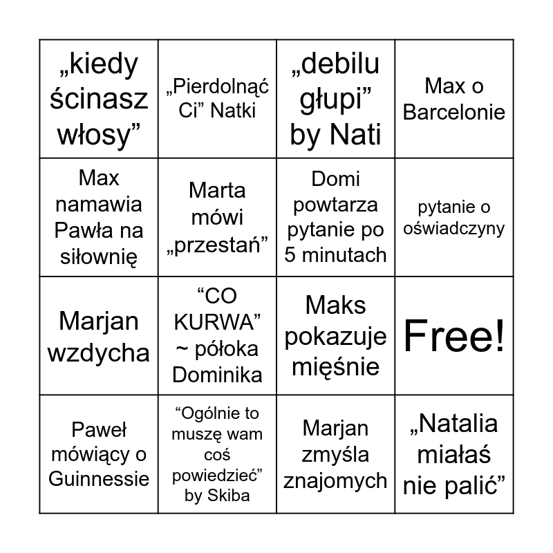 This bingo card has 20 words: Free!, Max vs Nati kłótnia, „debilu głupi” by Nati, Mina dezaprobaty na twarzy Marty kiedy Paweł robi coś źle, Paweł mówiący o Guinnessie, Max namawia Pawła na siłownię, “Ogólnie to muszę wam coś powiedzieć” by Skiba, „kiedy ścinasz włosy”, Marjan wzdycha, „Pierdolnąć Ci” Natki, “CO KURWA” ~ półoka Dominika, Maks pokazuje mięśnie, Marta mówi „przestań”, „Natalia miałaś nie palić”, Domi powtarza pytanie po 5 minutach, Sobal coś tam ten, pytanie o oświadczyny, Max o Barcelonie, Marjan zmyśla znajomych and Paweł o Wolfsburgu.
