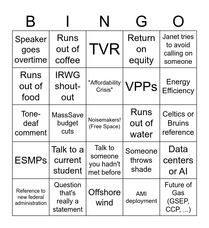 This bingo card has a free space and 24 words: Talk to a current student, Question that's really a statement, "Affordability Crisis", Reference to new federal administration, Janet tries to avoid calling on someone, Speaker goes overtime, Runs out of food, Runs out of coffee, Runs out of water, Talk to someone you hadn't met before, VPPs, Tone-deaf comment, Someone throws shade, Data centers or AI, IRWG shout-out, AMI deployment, Celtics or Bruins reference, TVR, Energy Efficiency, MassSave budget cuts, Future of Gas (GSEP, CCP, ...), ESMPs, Return on equity and Offshore wind.