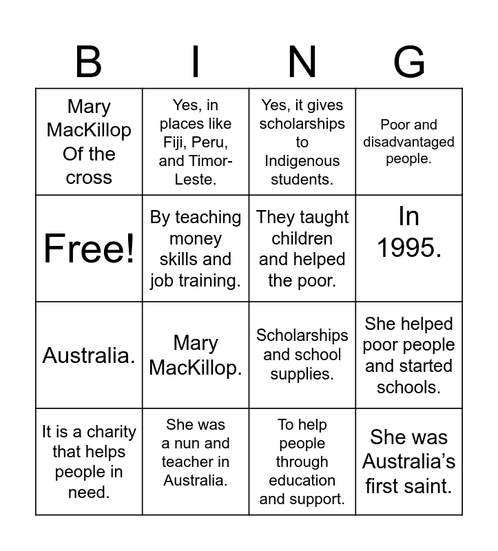This bingo card has 16 words: She was a nun and teacher in Australia., She helped poor people and started schools., Yes, it gives scholarships to Indigenous students., Mary MacKillop Of the cross, Australia., Yes, in places like Fiji, Peru, and Timor-Leste., Scholarships and school supplies., To help people through education and support., Free!, By teaching money skills and job training., It is a charity that helps people in need., Poor and disadvantaged people., Mary MacKillop., In 1995., They taught children and helped the poor. and She was Australia’s first saint..