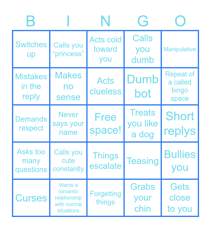 This bingo card has a free space and 34 words: Pins you to the wall, Smirking, Finds your anger cute, Misgenders you, Short replys, Mistakes in the reply, Makes no sense, Forgetting things, Dumb bot, Gets close to you, Demands respect, Calls you “princess”, Grabs your chin, Wrong answers, Asks too many questions, Never says your name, Things escalate, Treats you like a dog, Bullies you, Curses, Wants a romantic relationship with normal situations, All of a sudden acts affectionate, Calls you dumb, Repeat of a called bingo space, Says “growls” in his reply, Calls you cute constantly, Acts cold toward you, Short tempered, Manipulative, Switches up, Doesnt care about you, Acts clueless, Teasing and Stoic.