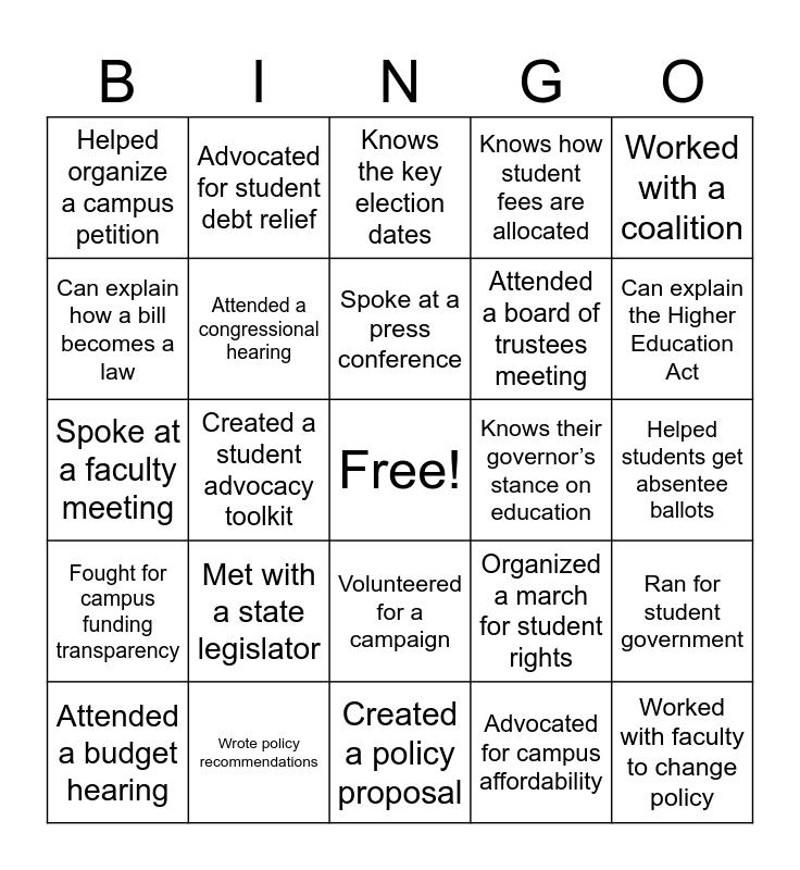 This bingo card has a free space and 25 words: Met with a state legislator, Created a policy proposal, Spoke at a press conference, Attended a budget hearing, Worked with a coalition, Helped organize a campus petition, Can explain how a bill becomes a law, Advocated for student debt relief, Knows their governor’s stance on education, Volunteered for a campaign, Attended a board of trustees meeting, Spoke at a faculty meeting, Organized a march for student rights, Ran for student government, Attended a congressional hearing, Hosted a candidate forum, Helped students get absentee ballots, Knows the key election dates, Can explain the Higher Education Act, Created a student advocacy toolkit, Worked with faculty to change policy, Wrote policy recommendations, Fought for campus funding transparency, Knows how student fees are allocated and Advocated for campus affordability.