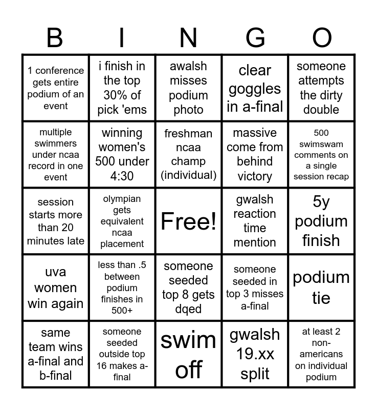 This bingo card has a free space and 32 words: gwalsh 19.xx split, top 8 relay dq, olympian gets equivalent ncaa placement, relay upset, uva women win again, winning women's 500 under 4:30, someone attempts the dirty double, podium tie, i finish in the top 30% of pick 'ems, kate douglass mention, freshman ncaa champ (individual), awalsh misses podium photo, br down kick dq, relay exchange of exactly 0.00, gwalsh reaction time mention, major technical glitch, same team wins a-final and b-final, session starts more than 20 minutes late, someone seeded top 8 gets dqed, less than .5 between podium finishes in 500+, someone seeded in top 3 misses a-final, 800 free relay under 6:00, 5y podium finish, someone seeded outside top 16 makes a-final, at least 2 non-americans on individual podium, clear goggles in a-final, massive come from behind victory, multiple swimmers under ncaa record in one event, 1 conference gets entire podium of an event, swim off, my alma mater scores points and 500 swimswam comments on a single session recap.