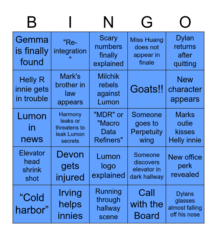 This bingo card has 25 words: Devon gets injured, Running through hallway scene, Milchik rebels against Lumon, “Cold harbor”, Dylan returns after quitting, Gemma is finally found, Helly R innie gets in trouble, "Re-integration ", Someone goes to Perpetuity wing, Lumon logo explained, Goats!!, Lumon in news, Someone discovers elevator in dark hallway, New office perk revealed, Mark's brother in law appears, Dylans glasses almost falling off his nose, Marks outie kisses Helly innie, Scary numbers finally explained, New character appears, Harmony leaks or threatens to leak Lumon secrets, "MDR" or "Macro Data Refiners", Irving helps innies, Elevator head shrink shot, Miss Huang does not appear in finale and Call with the Board.
