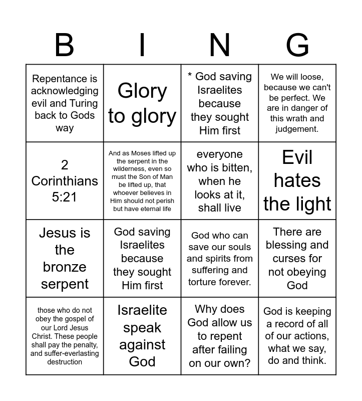 This bingo card has 16 words: Israelite speak against God, There are blessing and curses for not obeying God, * God saving Israelites because they sought Him first, Repentance is acknowledging evil and Turing back to Gods way, Jesus is the bronze serpent, Glory to glory, God who can save our souls and spirits from suffering and torture forever., Why does God allow us to repent after failing on our own?, 2 Corinthians 5:21, And as Moses lifted up the serpent in the wilderness, even so must the Son of Man be lifted up, that whoever believes in Him should not perish but have eternal life, those who do not obey the gospel of our Lord Jesus Christ. These people shall pay the penalty, and suffer-everlasting destruction, We will loose, because we can't be perfect. We are in danger of this wrath and judgement., God saving Israelites because they sought Him first, Evil hates the light, everyone who is bitten, when he looks at it, shall live and God is keeping a record of all of our actions, what we say, do and think..