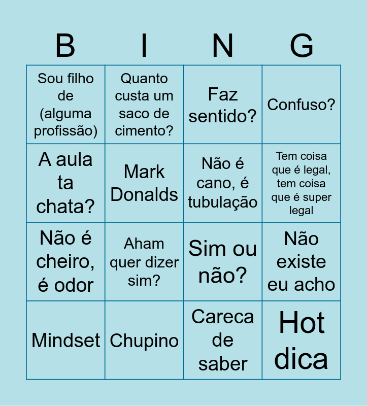 This bingo card has 16 words: Mindset, Chupino, Faz sentido?, Confuso?, A aula ta chata?, Quanto custa um saco de cimento?, Sim ou não?, Não existe eu acho, Sou filho de (alguma profissão), Mark Donalds, Careca de saber, Tem coisa que é legal, tem coisa que é super legal, Não é cheiro, é odor, Aham quer dizer sim?, Não é cano, é tubulação and Hot dica.