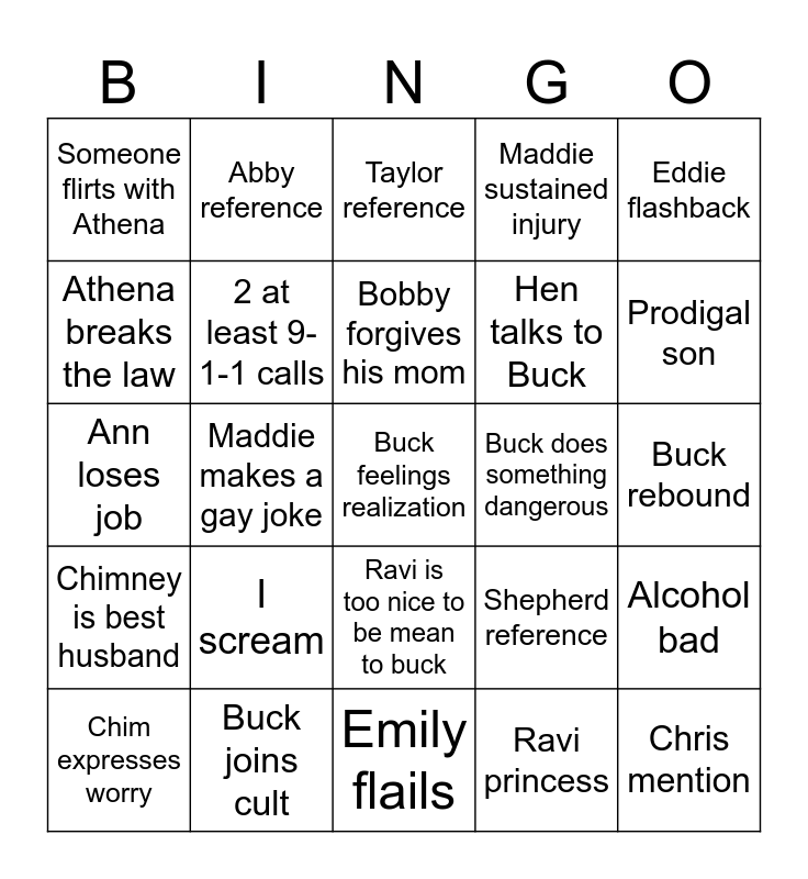 This bingo card has a free space and 24 words: I scream, Buck joins cult, Bobby forgives his mom, Chim expresses worry, Eddie flashback, Someone flirts with Athena, Athena breaks the law, Abby reference, Buck does something dangerous, Ravi is too nice to be mean to buck, Hen talks to Buck, Ann loses job, Shepherd reference, Alcohol bad, 2 at least 9-1-1 calls, Ravi princess, Buck rebound, Taylor reference, Prodigal son, Maddie makes a gay joke, Chris mention, Chimney is best husband, Maddie sustained injury and Emily flails.