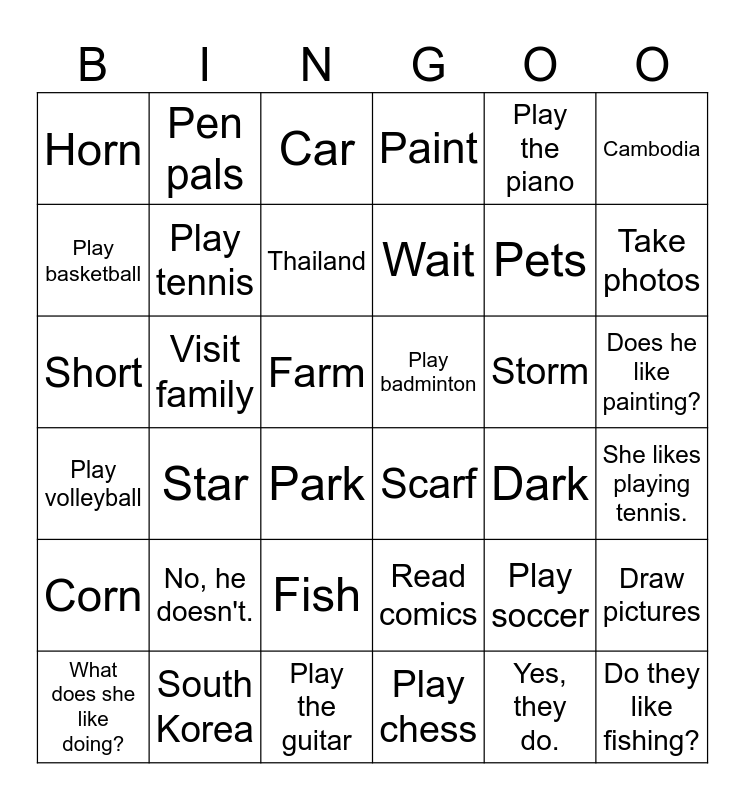 This bingo card has 36 words: Read comics, Fish, Play chess, Play basketball, Play volleyball, Play badminton, Play tennis, Play the guitar, Play the piano, Play soccer, Take photos, Paint, Draw pictures, Visit family, Wait, Horn, Corn, Storm, Short, Car, Farm, Star, Scarf, Park, Dark, Pen pals, Pets, South Korea, Thailand, Cambodia, Do they like fishing?, What does she like doing?, She likes playing tennis., Does he like painting?, No, he doesn't. and Yes, they do..