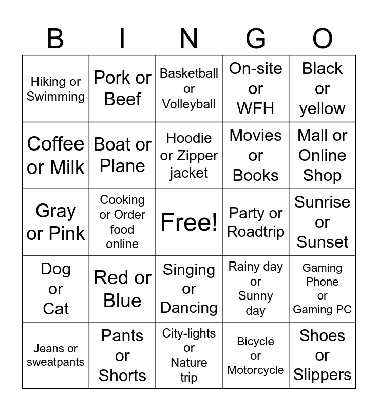 This bingo card has a free space and 24 words: Red or Blue, Pants or Shorts, Hoodie or Zipper jacket, Jeans or sweatpants, Black or yellow, Hiking or Swimming, Coffee or Milk, Pork or Beef, Party or Roadtrip, Singing or Dancing, Movies or Books, Gray or Pink, Rainy day or Sunny day, Gaming Phone or Gaming PC, Boat or Plane, Bicycle or Motorcycle, Sunrise or Sunset, Basketball or Volleyball, Mall or Online Shop, Cooking or Order food online, Shoes or Slippers, Dog or Cat, On-site or WFH and City-lights or Nature trip.