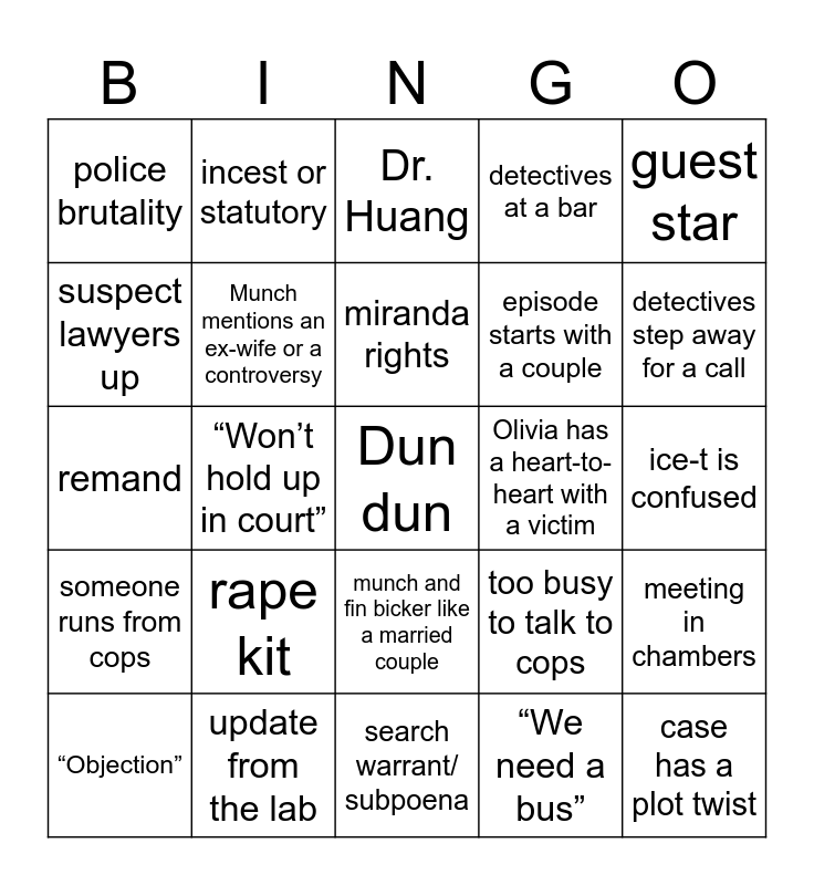This bingo card has a free space and 24 words: “Objection”, rape kit, miranda rights, “We need a bus”, guest star, police brutality, incest or statutory, Dr. Huang, Olivia has a heart-to-heart with a victim, ice-t is confused, remand, Munch mentions an ex-wife or a controversy, too busy to talk to cops, meeting in chambers, suspect lawyers up, update from the lab, search warrant/ subpoena, detectives at a bar, detectives step away for a call, someone runs from cops, “Won’t hold up in court”, munch and fin bicker like a married couple, episode starts with a couple and case has a plot twist.
