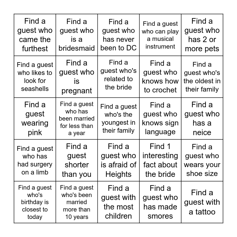 This bingo card has 25 words: Find a guest shorter than you, Find a guest with the most children, Find a guest who's related to the bride, Find a guest who's birthday is closest to today, Find a guest who has 2 or more pets, Find a guest who came the furthest, Find a guest who likes to look for seashells, Find a guest who is a bridesmaid, Find a guest who knows sign language, Find a guest who is afraid of Heights, Find a guest who knows how to crochet, Find a guest wearing pink, Find 1 interesting fact about the bride, Find a guest who wears your shoe size, Find a guest who is pregnant, Find a guest with a tattoo, Find a guest who has a neice, Find a guest who has never been to DC, Find a guest who's the oldest in their family, Find a guest who has been married for less than a year, Find a guest who's the youngest in their family, Find a guest who's been married more than 10 years, Find a guest who has had surgery on a limb, Find a guest who can play a musical instrument and Find a guest who has made smores.