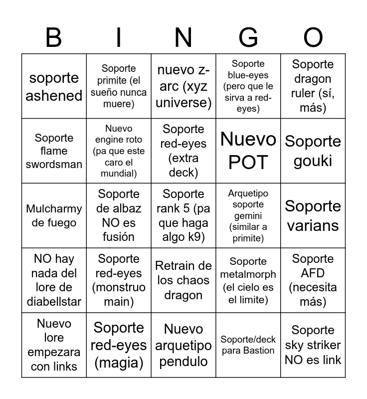This bingo card has a free space and 24 words: Soporte red-eyes (monstruo main), Soporte red-eyes (magia), Soporte red-eyes (extra deck), Nuevo lore empezara con links, Soporte dragon ruler (sí, más), soporte ashened, Soporte flame swordsman, Soporte primite (el sueño nunca muere), Arquetipo soporte gemini (similar a primite), Retrain de los chaos dragon, Nuevo POT, Mulcharmy de fuego, Soporte metalmorph (el cielo es el limite), Soporte AFD (necesita más), Nuevo engine roto (pa que este caro el mundial), Soporte/deck para Bastion, Soporte varians, nuevo z-arc (xyz universe), Soporte gouki, Soporte de albaz NO es fusión, Soporte sky striker NO es link, NO hay nada del lore de diabellstar, Soporte blue-eyes (pero que le sirva a red-eyes) and Nuevo arquetipo pendulo.