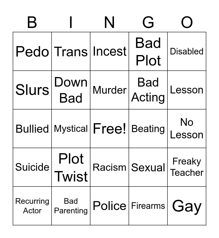 This bingo card has a free space and 24 words: Plot Twist, Bad Parenting, Murder, Recurring Actor, Disabled, Pedo, Slurs, Trans, Beating, Racism, Bad Acting, Bullied, Sexual, Freaky Teacher, Down Bad, Firearms, No Lesson, Incest, Lesson, Mystical, Gay, Suicide, Bad Plot and Police.