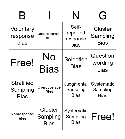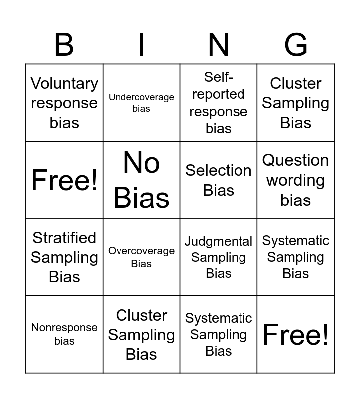 This bingo card has 16 words: Cluster Sampling Bias, Systematic Sampling Bias, Self-reported response bias, Voluntary response bias, Stratified Sampling Bias, Undercoverage bias, Judgmental Sampling Bias, Systematic Sampling Bias, Free!, No Bias, Nonresponse bias, Cluster Sampling Bias, Overcoverage Bias, Question wording bias, Selection Bias and Free!.