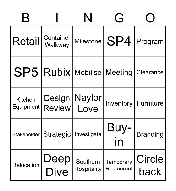 This bingo card has a free space and 24 words: Strategic, Deep Dive, Mobilise, Relocation, Program, Retail, SP5, Container Walkway, Inventory, Investigate, Meeting, Kitchen Equipment, Buy-in, Branding, Rubix, Temporary Restaurant, Furniture, Milestone, Clearance, Design Review, Circle back, Stakeholder, SP4 and Southern Hospitality.