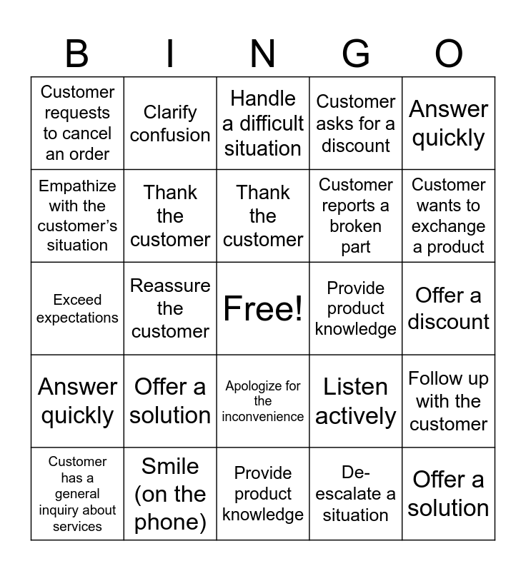 This bingo card has a free space and 24 words: Offer a solution, Smile (on the phone), Thank the customer, Customer has a general inquiry about services, Answer quickly, Customer requests to cancel an order, Empathize with the customer’s situation, Clarify confusion, Provide product knowledge, Apologize for the inconvenience, Customer reports a broken part, Exceed expectations, Listen actively, Follow up with the customer, Thank the customer, De-escalate a situation, Offer a discount, Handle a difficult situation, Customer wants to exchange a product, Reassure the customer, Offer a solution, Answer quickly, Customer asks for a discount and Provide product knowledge.