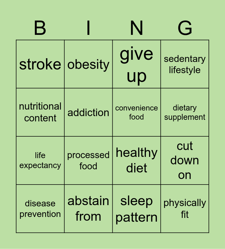 This bingo card has 16 words: abstain from, cut down on, give up, stroke, life expectancy, obesity, healthy diet, sleep pattern, nutritional content, addiction, disease prevention, sedentary lifestyle, processed food, dietary supplement, convenience food and physically fit.