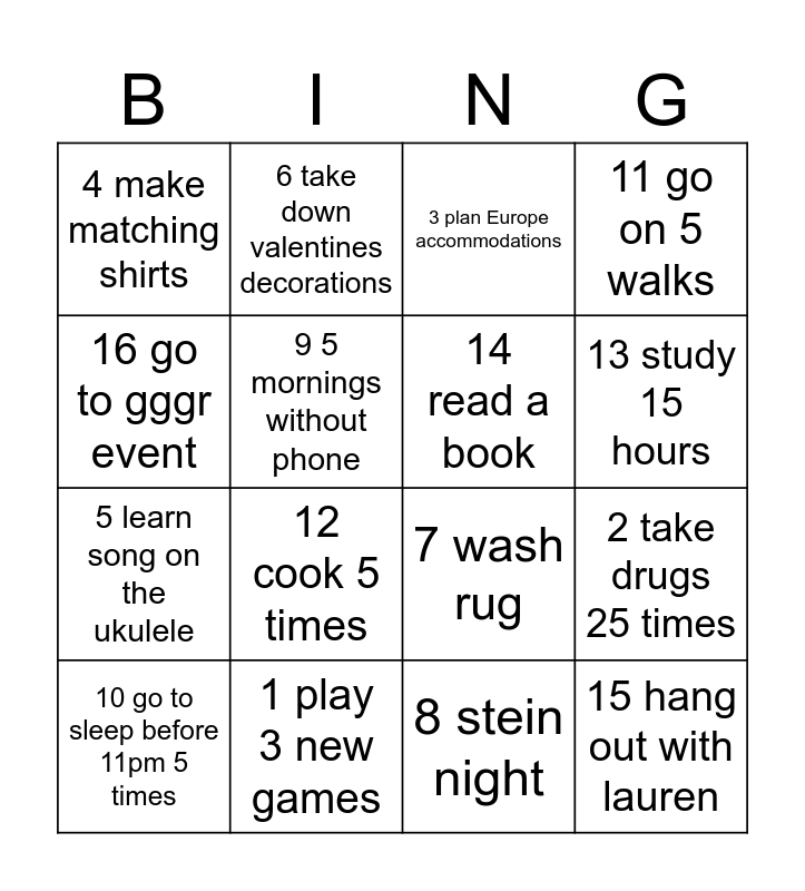 This bingo card has 16 words: 1 play 3 new games, 2 take drugs 25 times, 3 plan Europe accommodations, 4 make matching shirts, 5 learn song on the ukulele, 6 take down valentines decorations, 7 wash rug, 8 stein night, 16 go to gggr event, 9 5 mornings without phone, 10 go to sleep before 11pm 5 times, 11 go on 5 walks, 12 cook 5 times, 13 study 15 hours, 14 read a book and 15 hang out with lauren.