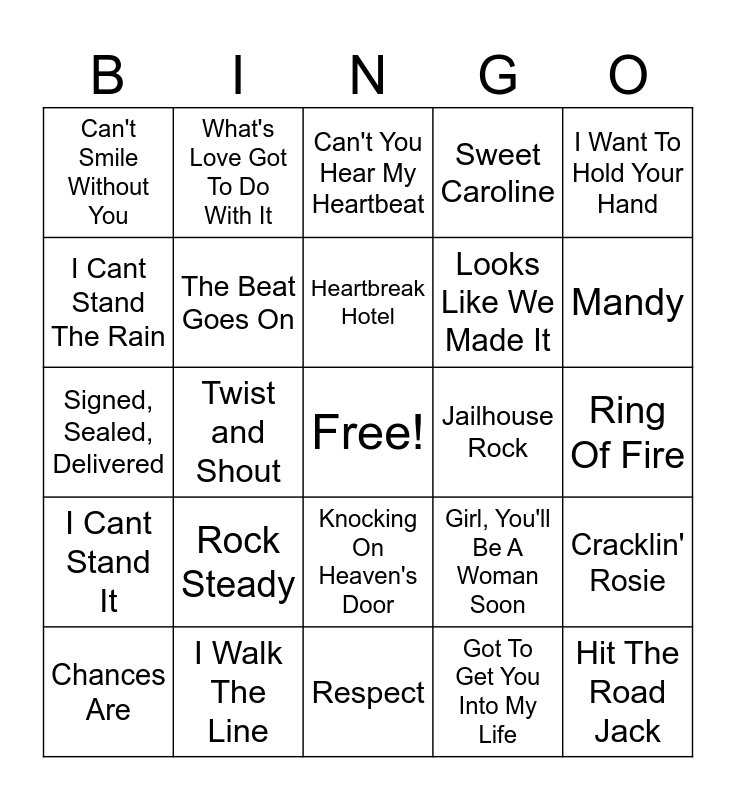 This bingo card has a free space and 46 words: Georgia On My Mind, Hit The Road Jack, I Believe To My Soul, Respect, Rock Steady, You Make Me Feel Like A Natural Woman, What's Love Got To Do With It, Proud Mary, I Cant Stand The Rain, I Got You Babe, The Beat Goes On, Sweet Caroline, Cracklin' Rosie, Girl, You'll Be A Woman Soon, Song Sung Blue, I'm Running Out Of Love, Heartbreak Hotel, Jailhouse Rock, Burning Love, I Want To Hold Your Hand, Twist and Shout, Got To Get You Into My Life, Can't Smile Without You, Looks Like We Made It, Copacabana, Mandy, Chances Are, I Shot The Sheriff, Knocking On Heaven's Door, I Cant Stand It, 9 to 5, Jolene, Desperado, Take It Easy, Folsom Prison Blues, I Walk The Line, Ring Of Fire, Tragedy, Tennessee Flat-Top Box, Go All The Way, Lyin Eyes, Can't You Hear My Heartbeat, Signed, Sealed, Delivered, Chrystal Clear/Muddy Waters, I Guess Why They Call It The Blues and Bennie And The Jets.