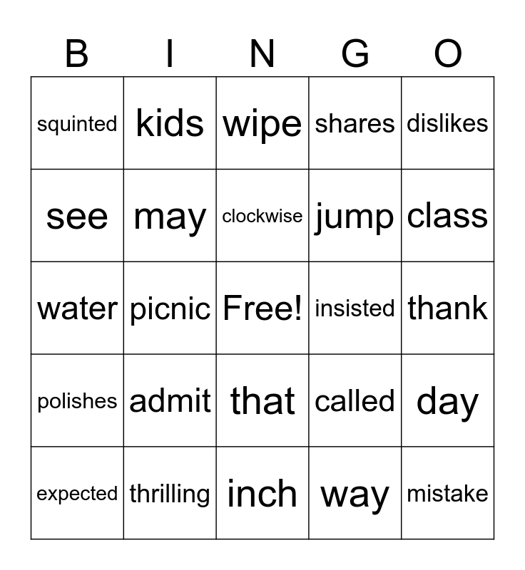 This bingo card has a free space and 24 words: admit, thrilling, clockwise, expected, dislikes, squinted, see, kids, insisted, that, jump, water, called, day, may, way, thank, wipe, class, picnic, mistake, polishes, shares and inch.