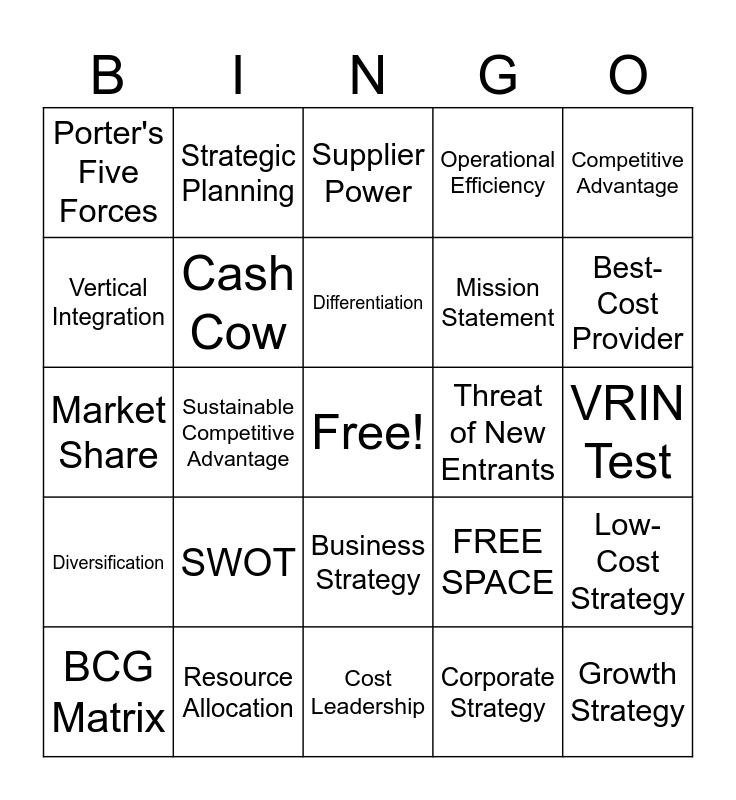 This bingo card has a free space and 25 words: SWOT, Cost Leadership, Differentiation, BCG Matrix, Competitive Advantage, Porter's Five Forces, Vertical Integration, Strategic Planning, Threat of New Entrants, Business Strategy, Mission Statement, Market Share, FREE SPACE, Low-Cost Strategy, Cash Cow, Focus Strategy, VRIN Test, Supplier Power, Best-Cost Provider, Sustainable Competitive Advantage, Growth Strategy, Resource Allocation, Diversification, Operational Efficiency and Corporate Strategy.