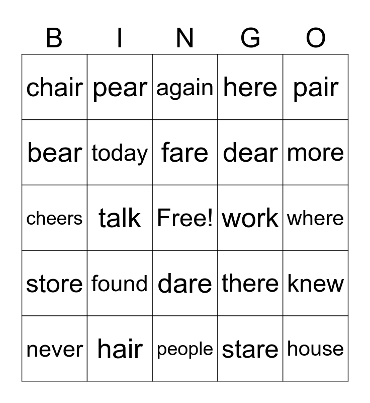 This bingo card has a free space and 26 words: dare, stare, fare, hair, pair, chair, bear, pear, where, there, dear, cheers, knew, never, talk, north, here, store, again, house, more, people, work, found, today and very.