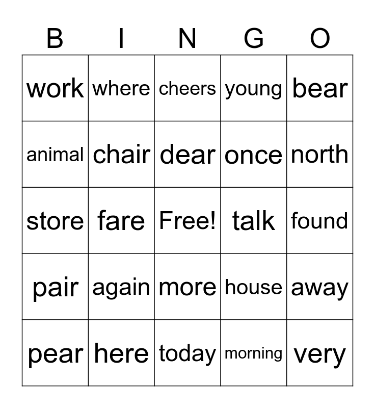 This bingo card has a free space and 33 words: dare, stare, fare, hair, pair, chair, bear, pear, where, there, dear, cheers, knew, never, talk, north, here, store, again, house, more, people, work, found, today, very, young, once, animal, away, watch, morning and thought.