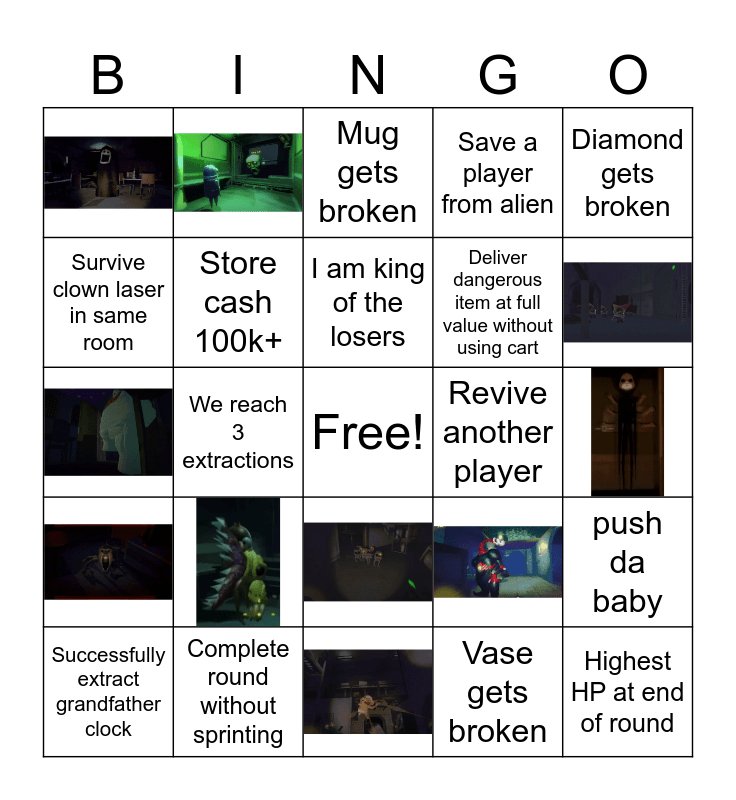 This bingo card has 18 images, a free space and 26 words: Host dies, Highest HP at end of round, Successfully extract piano, Successfully extract grandfather clock, Blind guy falls down stairs, Vase gets broken, Mug gets broken, Plate gets broken, Diamond gets broken, Complete round without sprinting, Save a player from alien, Revive another player, Monster Dies, push da baby, someone buys something useless, something blows up not in the store, We reach 3 extractions, Clutch, someone dies in the shop, we make 25k+ more than needed and I'm alive, I am king of the losers, Survive clown laser in same room, Deliver dangerous item at full value without using cart, Lead chef frog away from the cart, Store cash 100k+ and Evade knife lady.