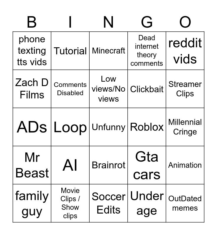 This bingo card has a free space and 24 words: AI, Movie Clips / Show clips, Low views/No views, family guy, reddit vids, phone texting tts vids, Zach D Films, Tutorial, Roblox, Brainrot, Clickbait, ADs, Gta cars, Animation, Comments Disabled, Under age, Millennial Cringe, Minecraft, Streamer Clips, Loop, OutDated memes, Mr Beast, Dead internet theory comments and Soccer Edits.
