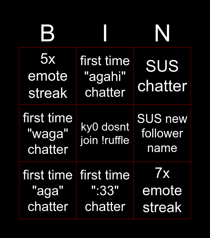 This bingo card has a free space and 8 words: SUS new follower name, SUS chatter, first time "agahi" chatter, first time "aga" chatter, 5x emote streak, 7x emote streak, first time "waga" chatter and first time ":33" chatter.