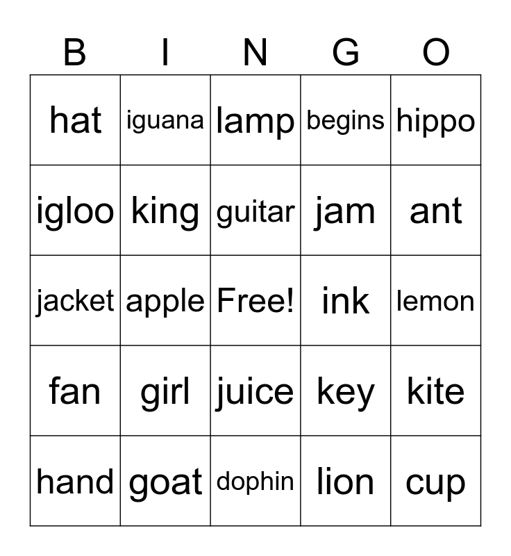 This bingo card has a free space and 24 words: girl, goat, guitar, hand, hippo, hat, igloo, iguana, ink, juice, jam, jacket, key, kite, king, lion, lemon, lamp, ant, apple, cup, fan, begins and dophin.